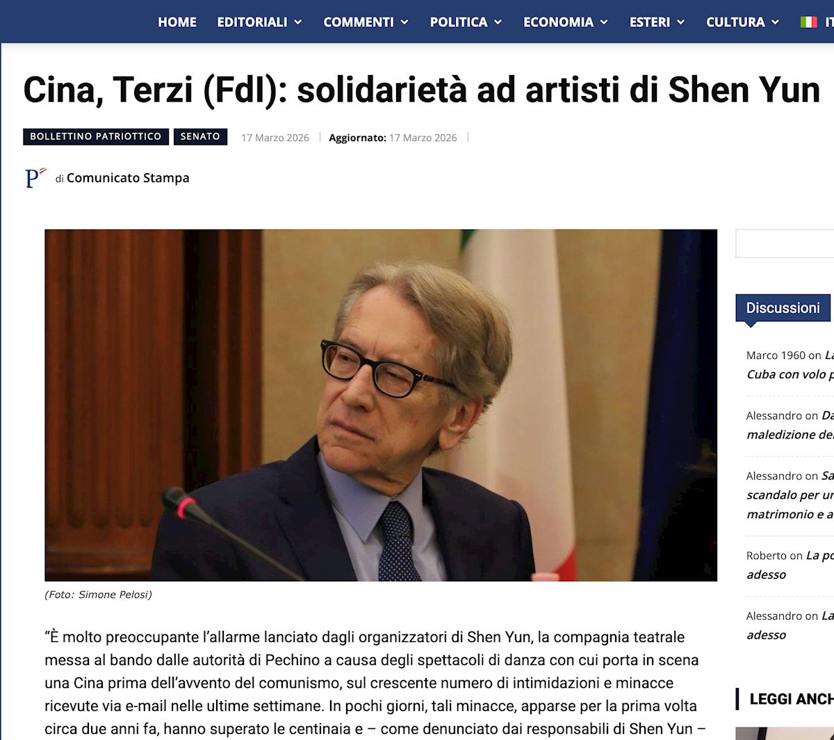 Giulio Terzi, Senator and former Italian Foreign Minister, issued a letter of support for Shen Yun which was published in multiple media outlets. The image is a screenshot of one of these media websites.