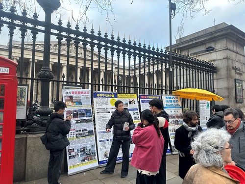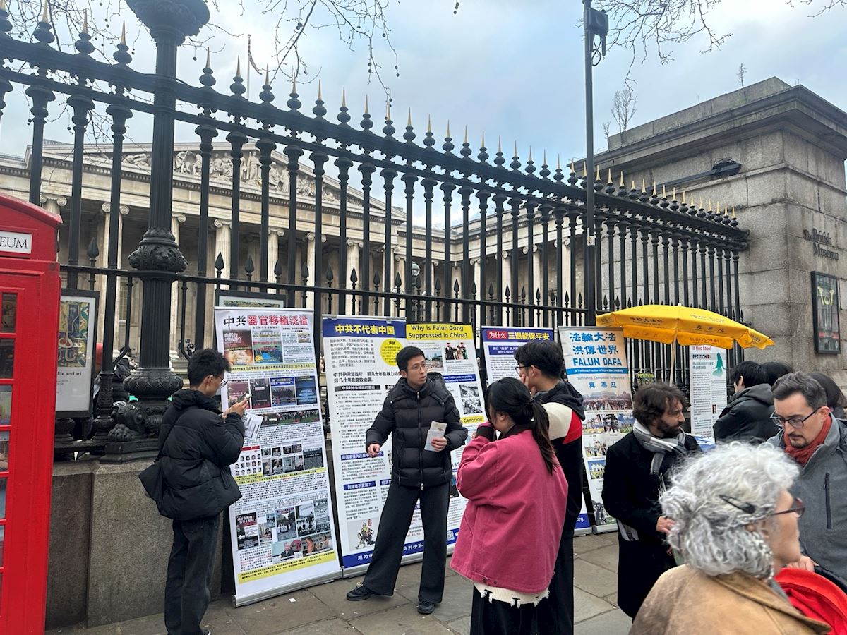 To help people, especially Chinese tourists, learn what Falun Gong is and refute the CCP’s defamatory propaganda, practitioners maintain a presence near the British Museum, which is a popular landmark. They have a permit to hold the activity, and they are protected by the London police.