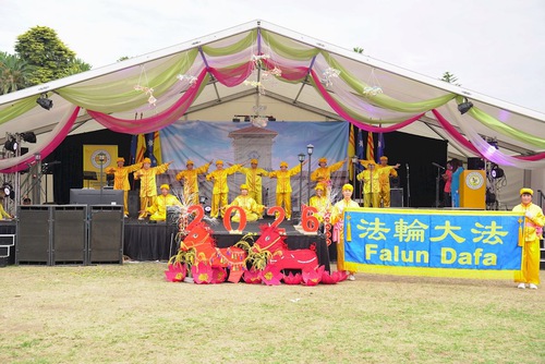 A lively temple fair was held at Braybrook in western Melbourne on Lunar New Year’s Eve, February 16, drawing people to welcome the new year. The Falun Dafa practitioners’ waist drum team was invited to start the fair and later paraded through the fair ground several times.