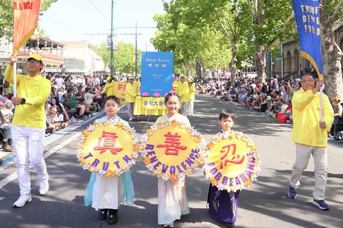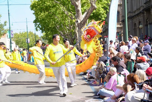 The parade officially began at 12:30 p.m. and the route was 5 km (3.1 miles) long. Around 100 practitioners from Melbourne and Sydney forming several major themes in the group took part in the parade. Spectators on both sides of the road clapped and cheered as practitioners marched past. From time to time, people could be heard exclaiming: “Falun Dafa!” “Authentic, traditional culture,” and, “You are amazing!”