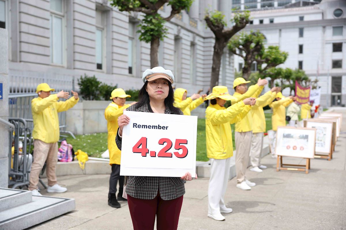 Ms. Li Ke, a Chinese woman who lives in San Francisco, said she always wanted to attend a Falun Gong activity. When she learned of the event that day, she came to show her support. Holding a sign that read “Remember April 25,” she said, “We should learn from the spirit of the April 25 Appeal. My impression of Falun Gong practitioners is that they are especially honest.”