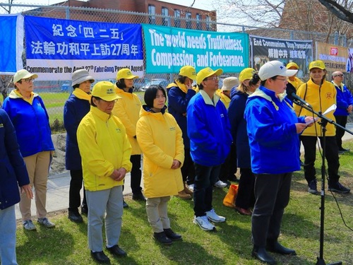 Falun Gong practitioners held a rally in front of the Chinese Embassy on Wednesday, April 22, 2026 to commemorate the 27th anniversary of the April 25 peaceful appeal. They called for an end to the persecution of Falun Gong in China.