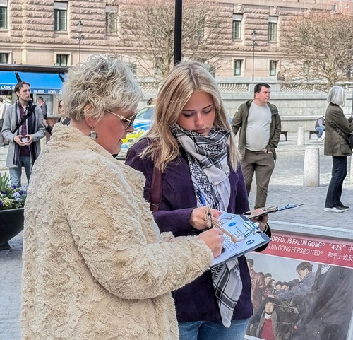 Many local residents and tourists learned about Falun Gong and the persecution during the event at Mynttorget, which is near Stockholm’s Old Town and the Royal Palace. The group exercise demonstration, posters, and banners drew the attention of passersby. People accepted flyers and talked with practitioners to learn more about Falun Gong. Many people signed the petition to support the practitioners and condemn the persecution, “Way to go. Keep up the good work.”