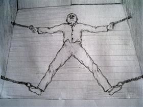 Torture illustration: tied in a spread eagle position