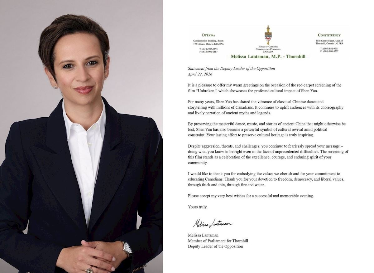 Melissa Lantsman MP sent a letter welcoming the film, “which showcases the profound cultural impact of Shen Yun.”