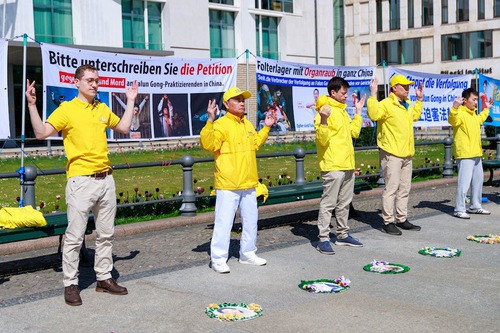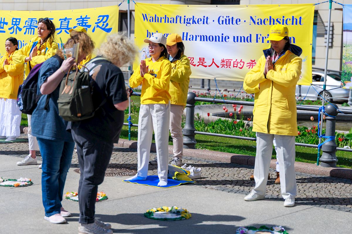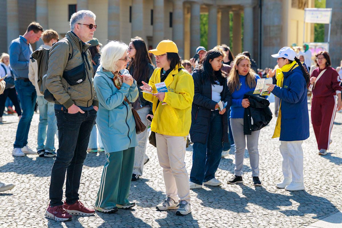 It was a sunshiny day, and people passing the Brandenburg Gate were drawn by the soothing music as practitioners demonstrated the exercises. After learning about Falun Gong and the persecution by the Chinese Communist Party (CCP), including forced organ harvesting, some passersby signed petitions that urged an end to the brutality. Some were also interested in learning the exercises.