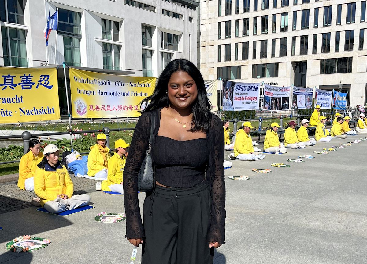 Sujana Sundran, a nurse from Munich who was visiting Berlin, and her friend Tia stopped to watch as practitioners did the exercises in front of the Brandenburg Gate. They talked with a practitioner at the information booth for a long time.