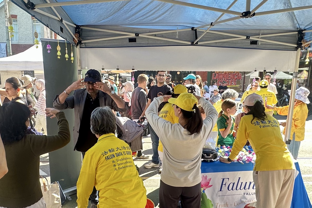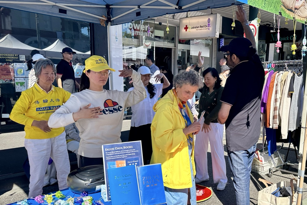 Nick, a lawyer who lives in Hawthorn, said he'd first heard about Falun Dafa two decades ago. He also began to pay attention to news on the practitioners’ efforts to end the persecution by reading The Epoch Times. He spoke to practitioners for a long time that day at the Falun Dafa booth. He also tried out the exercises.