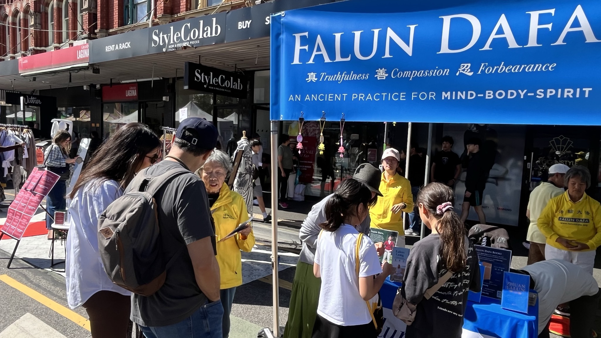 Residents and tourists learn about Falun Dafa.