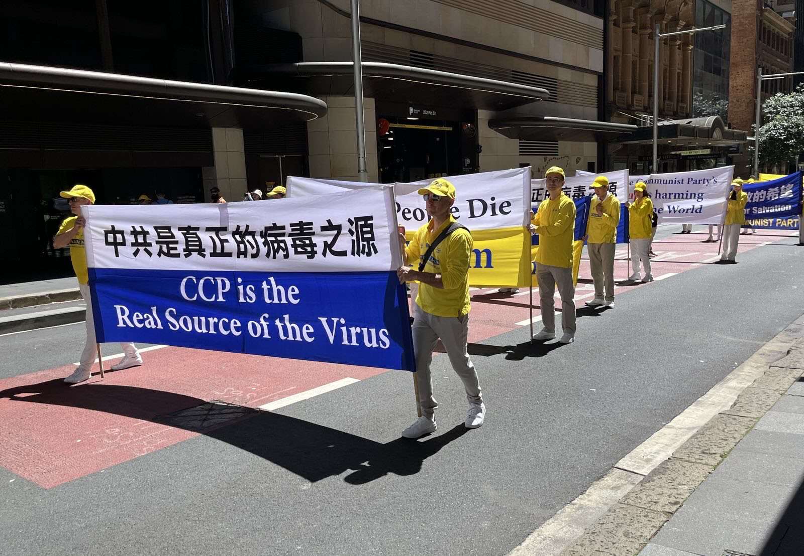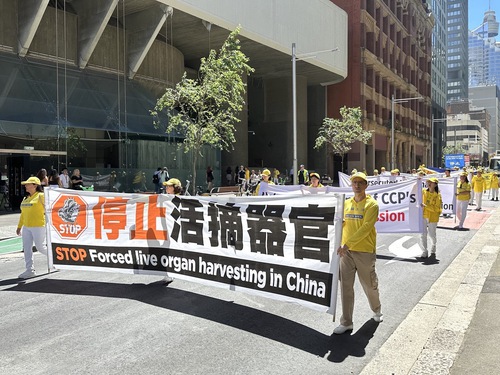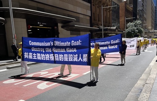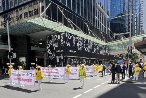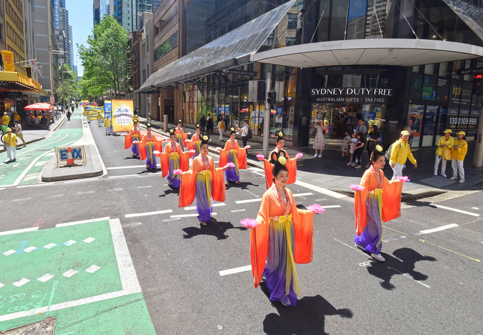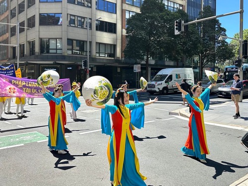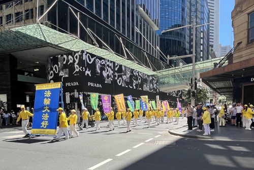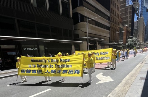(Minghui.org) Practitioners held a march in the center of Sydney’s financial district on October 10, 2025, to introduce the principles of Truthfulness, Compassion, and Forbearance to the public. They also raised awareness of the Chinese Communist Party’s (CCP) 26-year-long persecution of Falun Dafa (also known as Falun Gong) in China.