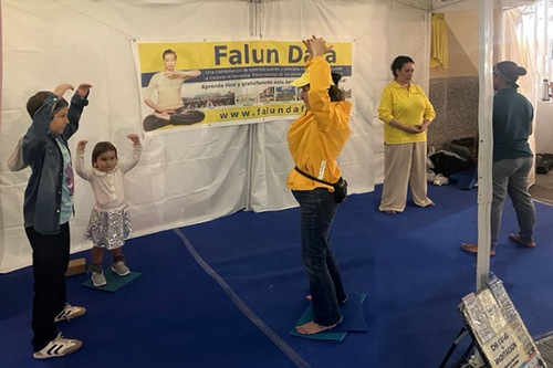 Many passersby stopped to watch as practitioners demonstrated the Falun Dafa exercises to soothing music, and some decided to try them. Several children returned to the booth time and again.