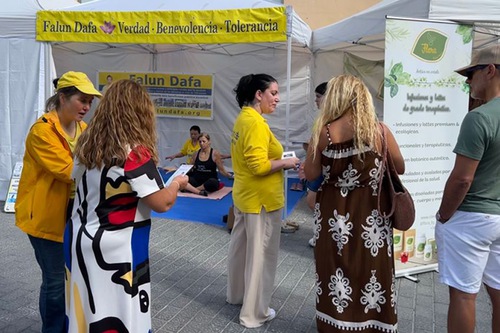 (Minghui.org) Practitioners introduced people to Falun Dafa in a market in Inca, a town on the Spanish island of Mallorca (Majorca), from October 18 to 19, 2025. Many residents and tourists learned the benefits of practicing Falun Dafa, and some started to learn the exercises. People bought copies of Falun Dafa’s main book Zhuan Falun and expressed interest in learning the exercises.