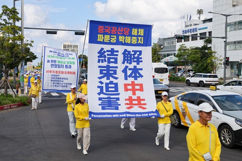 (Minghui.org) A parade to congratulate the 450 million Chinese who have withdrawn from the Chinese Communist Party (CCP) and its affiliated organizations was held on Jeju Island, South Korea, on September 21 and 22, 2025. Jeju Island is a favorite destination for Chinese tourists, offering visa-free entry and attracting a large number of visitors each year.