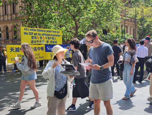 (Minghui.org) Falun Dafa practitioners held a rally in front of the Sydney Town Hall on September 28, 2025, to celebrate 450 million Chinese people quitting the Chinese Communist Party (CCP) and its affiliated youth organizations. Guests speakers commended the groundswell of withdrawals from the CCP, referring to those brave enough to withdraw from the CCP organizations as standing at the forefront of a future free China.