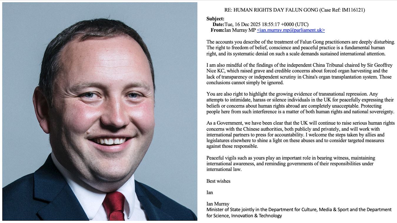 UK minister Ian Murray MP sent a letter of support for Falun Gong on International Human Rights Day.