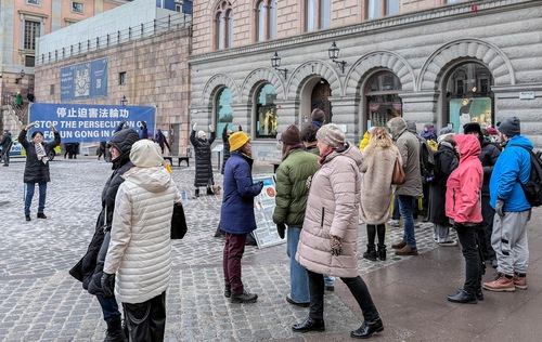 (Minghui.org) Falun Dafa practitioners held activities on Mynttorget near the Swedish Parliament Building on Fridays and Saturdays in November 2025. They demonstrated the exercises, raised awareness of the Chinese Communist Party’s (CCP) persecution, and collected signatures on a petition to end it. Many people signed the petition and said they admired the practitioners’ courage. Some Chinese tourists renounced their memberships in the CCP and its affiliated organizations during the events.