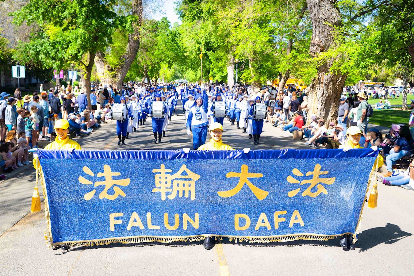 As the band members marched past the main stage on North Quad Avenue, the MC introduced them: “The group approaching now is the Falun Dafa Tian Guo marching band. In English, that means the band is from heaven. Falun Dafa is a cultivation practice based on Truthfulness, Compassion, Forbearance and includes five exercises.”