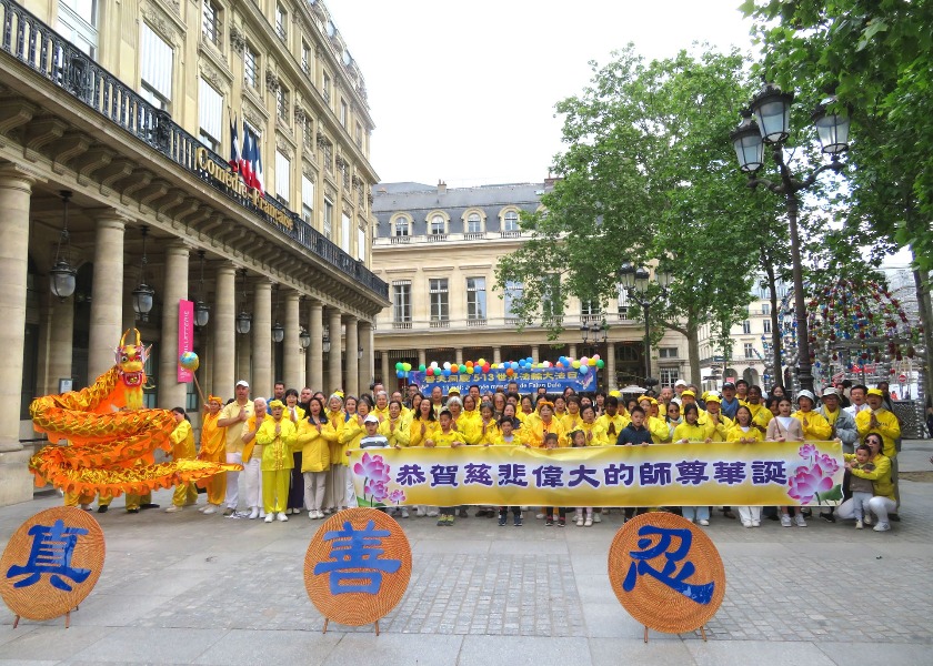 Practitioners in Paris held an event at Place Colette to celebrate World Falun Dafa Day, with many enjoying the event and signing a petition in support of their efforts.
