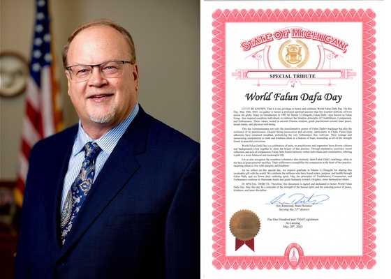 Michigan State Senator Jim Runestad of the 23rd District issued a Special Tribute on May 20, 2025, to honor the practitioners who selflessly introduce Falun Dafa.