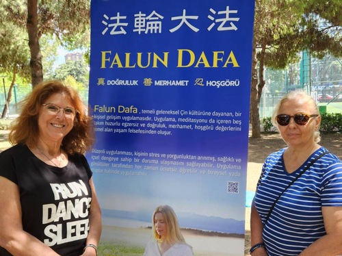 Sibel, a provincial sports coordinator, came to the festival with university students from her city. After hearing a practitioner’s introduction of Dafa and the Chinese Communist Party’s (CCP) persecution of Falun Dafa practitioners in China, Sibel said, “Your exercises look very soothing, and I feel peaceful when listening to your introduction. You carry pure energy! Please stay here. I would like to learn more and read your Falun Dafa Book.” Sibel watched the practitioners’ exercises for a long time. She also brought some students to watch, as well.