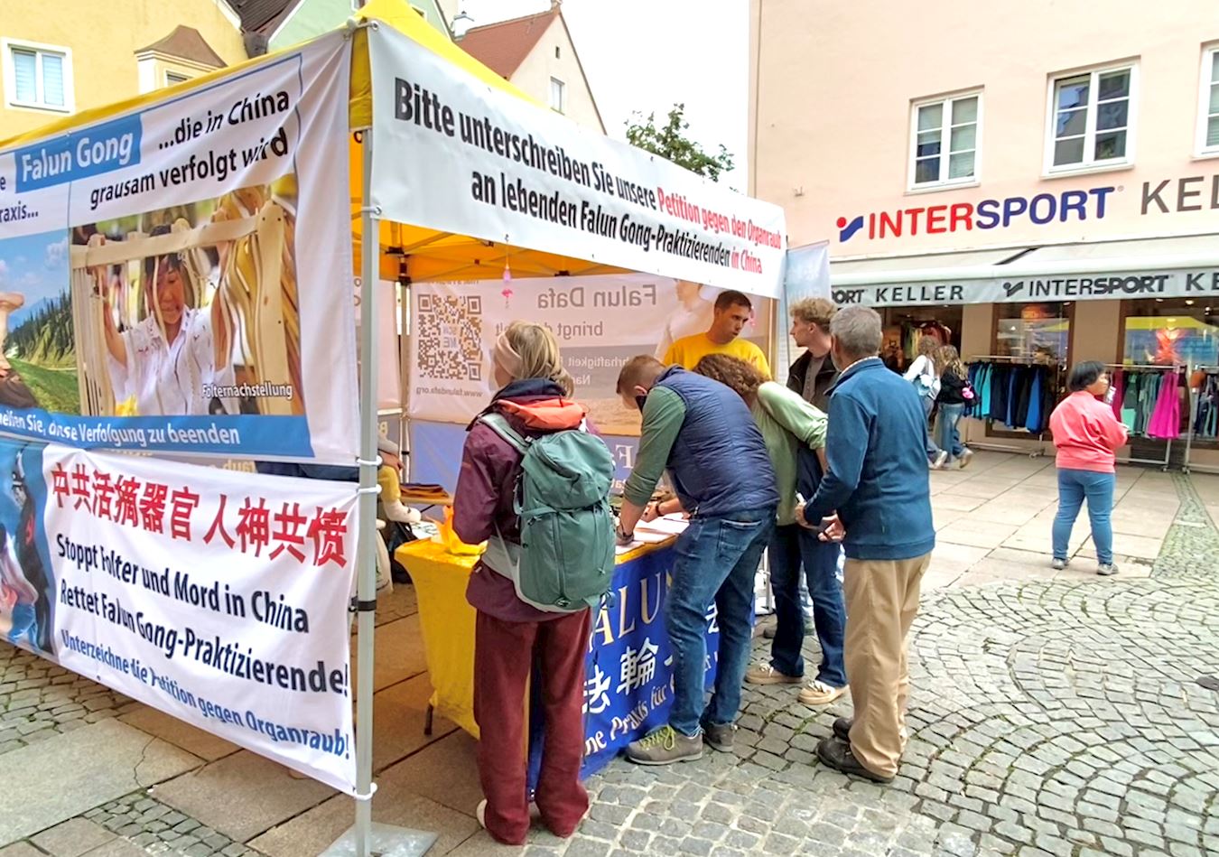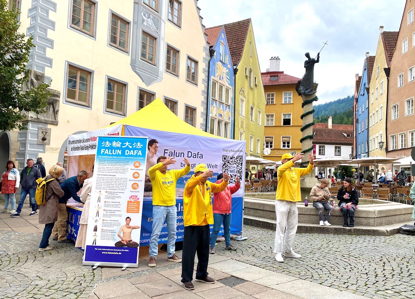 (Minghui.org) “Excuse me, do you have a practice site in Füssen?” “Where can we learn to practice Falun Dafa?” “You are doing great, please keep up your efforts.” These were some comments Falun Dafa practitioners heard during an information day event in Füssen, Germany, on August 23, 2025.
