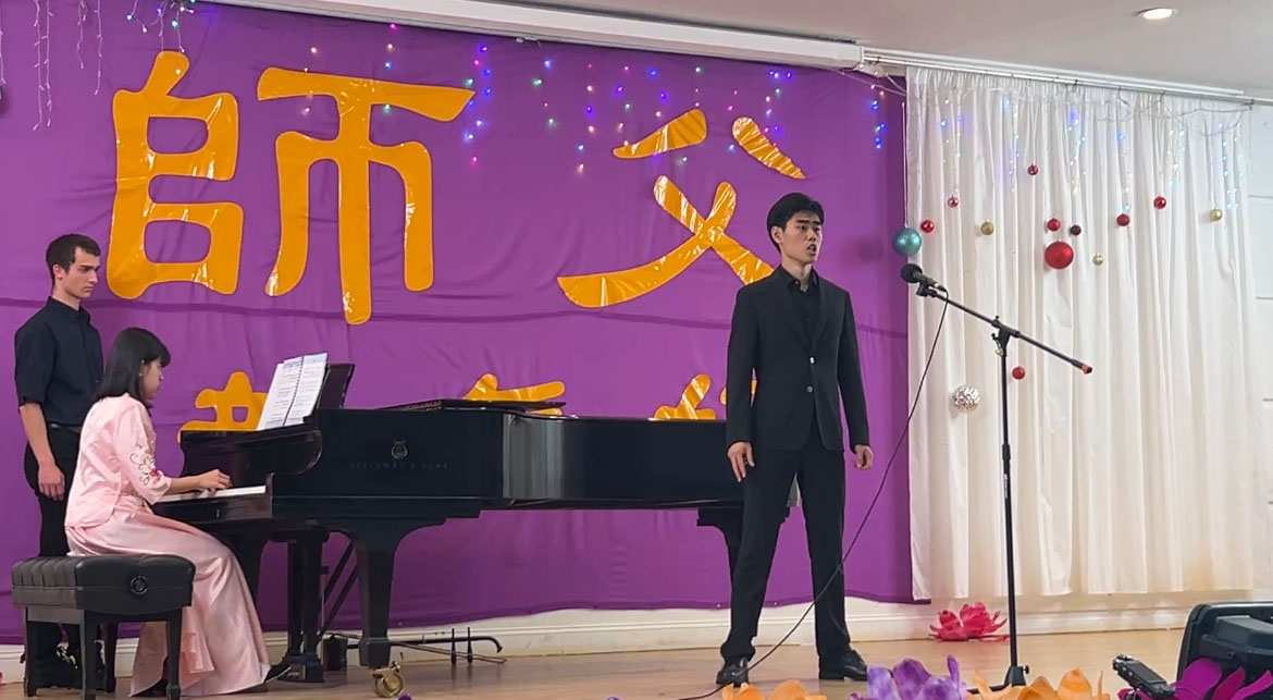 Bassist Kevin Zhang, a silver medalist at the 10th NTD Global Chinese Vocal Competition, sang “Hard to Cover Up,” a song composed by Mr. Li Hongzhi. A student at Northeastern University’s New York City campus, Kevin has practiced Falun Dafa with his mother since he was a child. He said, “Obtaining Falun Dafa is the luckiest thing that happened to me! Falun Dafa taught me to how to be a good person, to think of others, ways to deal with difficulties, to look inward when I encounter problems, and to search for my shortcomings and correct them. The mindset imparted by Dafa is key to my continued progress as a singer.”