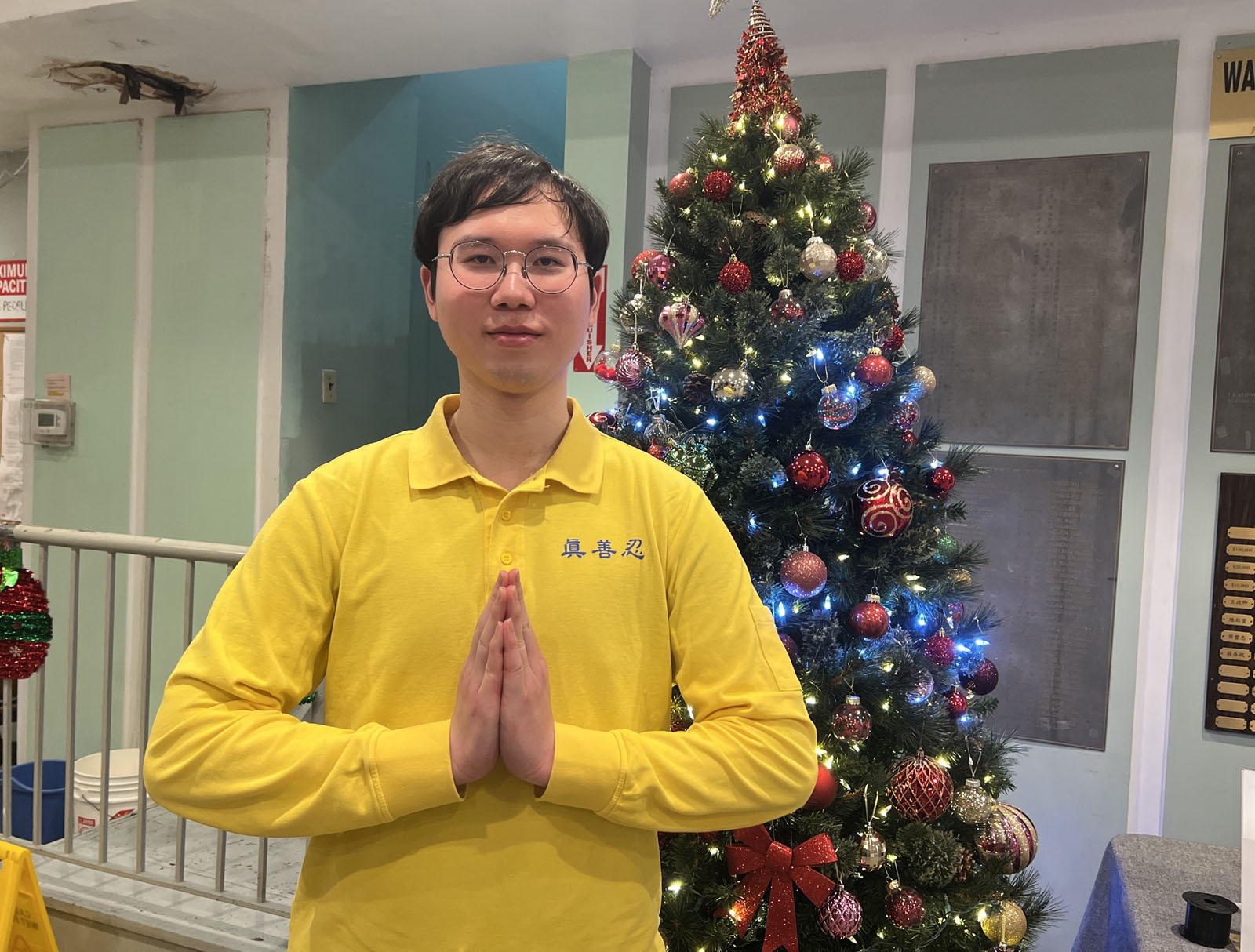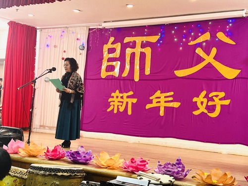 The warm and inviting atmosphere contrasted with the winter cold outside. The stage was decorated with flowers, and colorful lights highlighted a banner that read: “Happy New Year, Master.” The venue was packed with practitioners from different ethnic backgrounds. Ranging in age from 90 to just a few years old, from veteran practitioners to newcomers, they respectfully exclaimed in unison, “We wish Master a Happy New Year! Falun Dafa is good! Truthfulness-Compassion-Forbearance is good!”