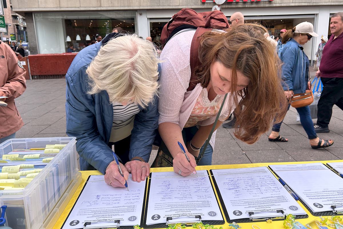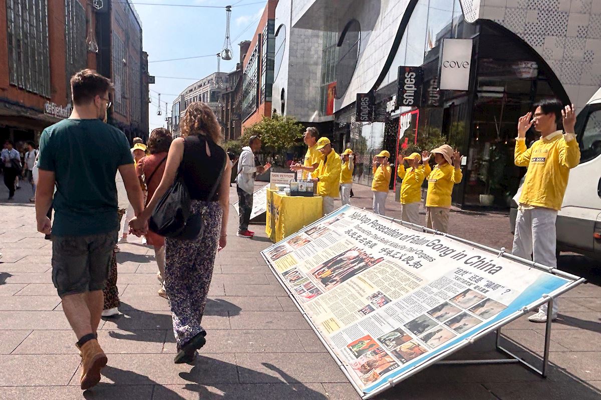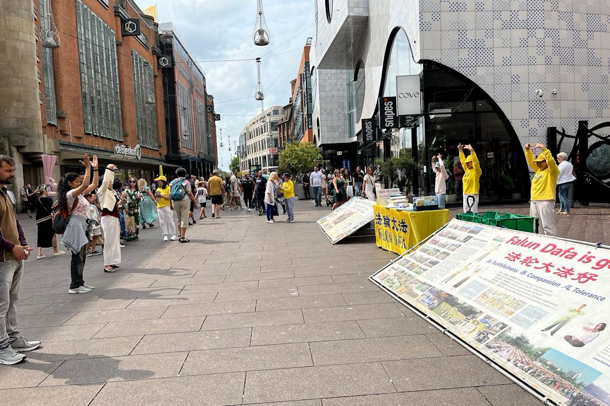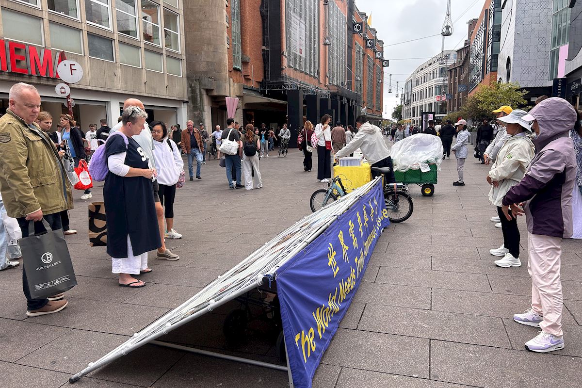 Practitioners in the Netherlands hold regular events on Grote Markststraat, a commercial street in the center of The Hague. They demonstrate the five exercises, hand out flyers, and talk to people. Business people, scholars, international students, human rights workers, and international tourists stop to learn about Falun Dafa and the CCP’s ongoing persecution. Many who hear about the persecution for the first time are stunned. Others who already know about the situation express their support and admiration for the practitioners.