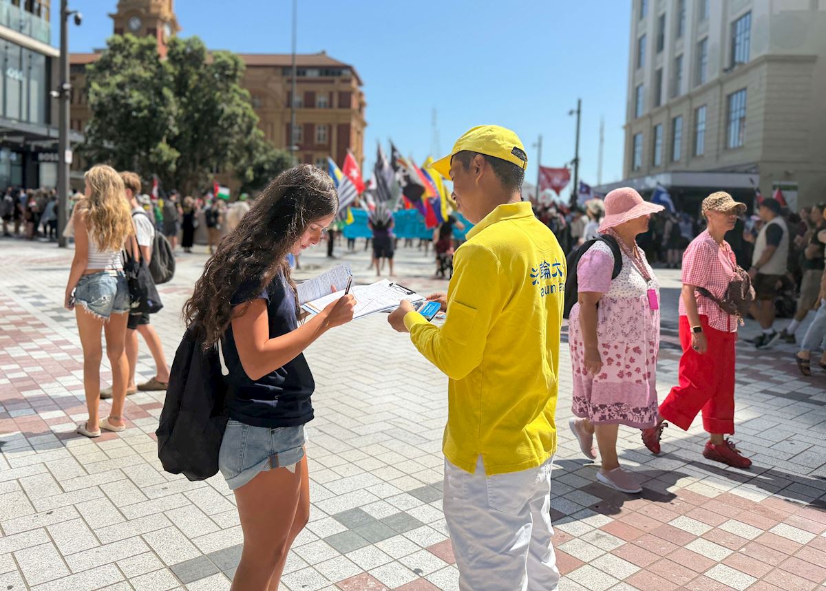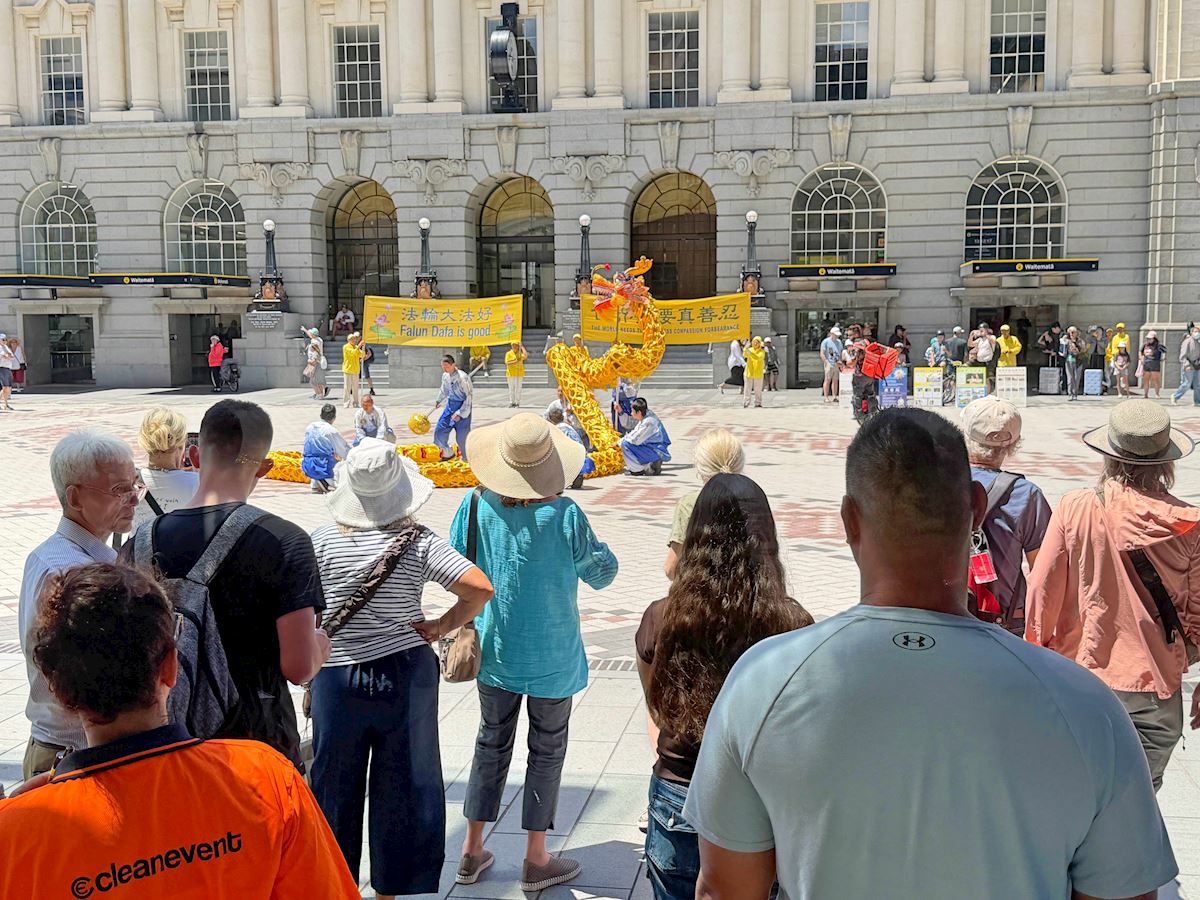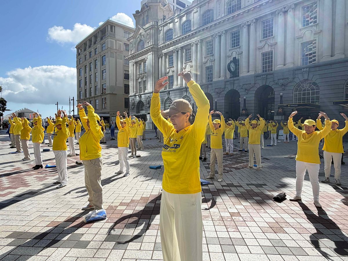 (Minghui.org) Practitioners held an event at Commercial Bay Plaza in Auckland on January 31, 2026, to introduce Falun Dafa to the public. They demonstrated the exercises and taught them for free. They also told people about the Falun Dafa practice and performed a dragon dance.