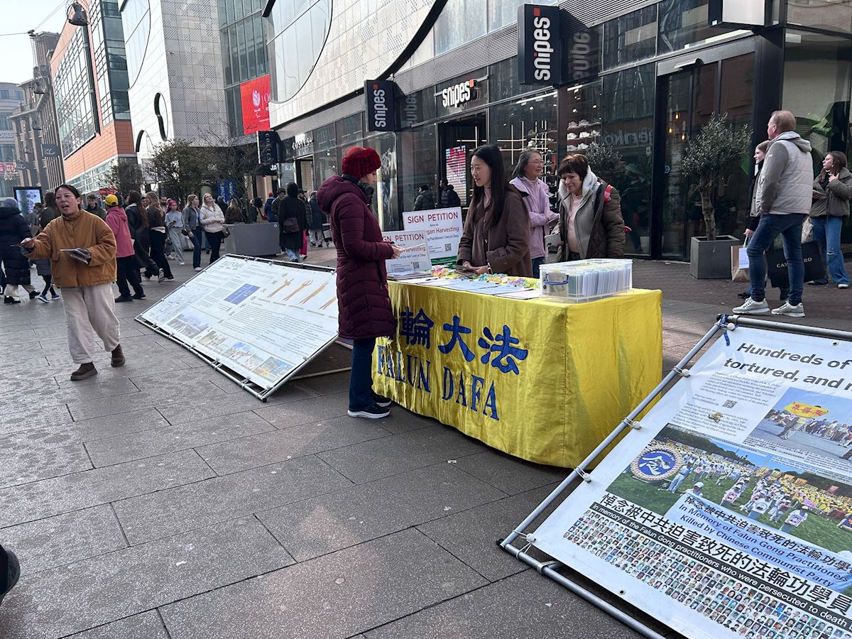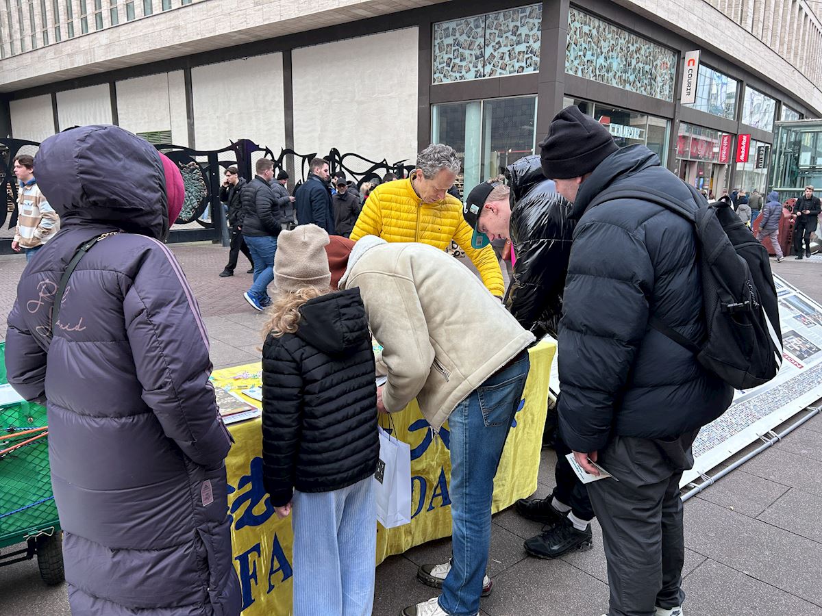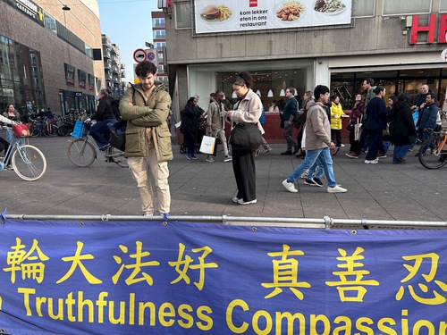 (Minghui.org) Falun Dafa practitioners held activities to introduce the practice at Grote Markststraat in The Hague in mid-February 2026. They demonstrated the exercises, distributed flyers, and told passersby about the Chinese Communist Party’s (CCP) persecution.