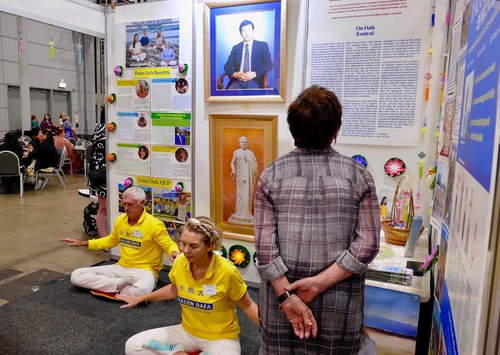 Visitors to the Falun Dafa booth read the information or were given flyers. They watched the exercise demonstration and talked to practitioners. Some learned the exercises on the spot, others bought the books, and asked how to join the group practice site.