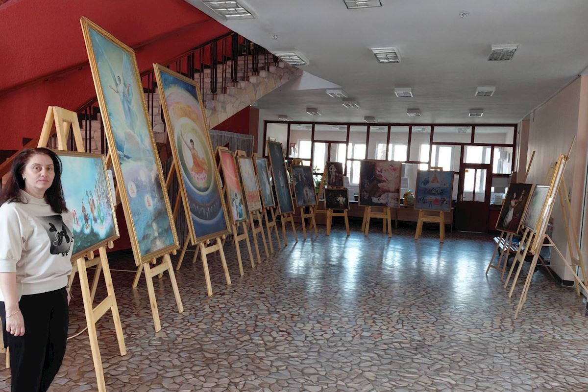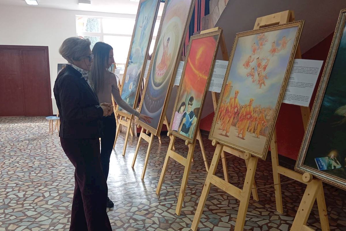 Twenty paintings were displayed in Ihtiman, and 15 were displayed in Belovo. Both exhibitions were arranged to highlight seven different themes: The Arrival of Lord Buddha—Buddha’s Light Illuminates Everywhere, The Joy of Cultivation, Persecution in China, Peaceful Resistance, Karmic Retribution, Buddha’s Boundless Compassion, and The Point of No Return.