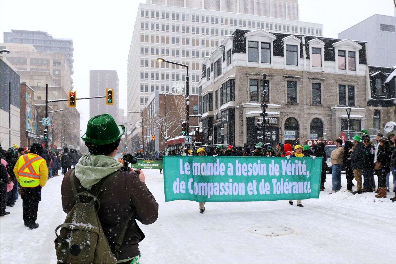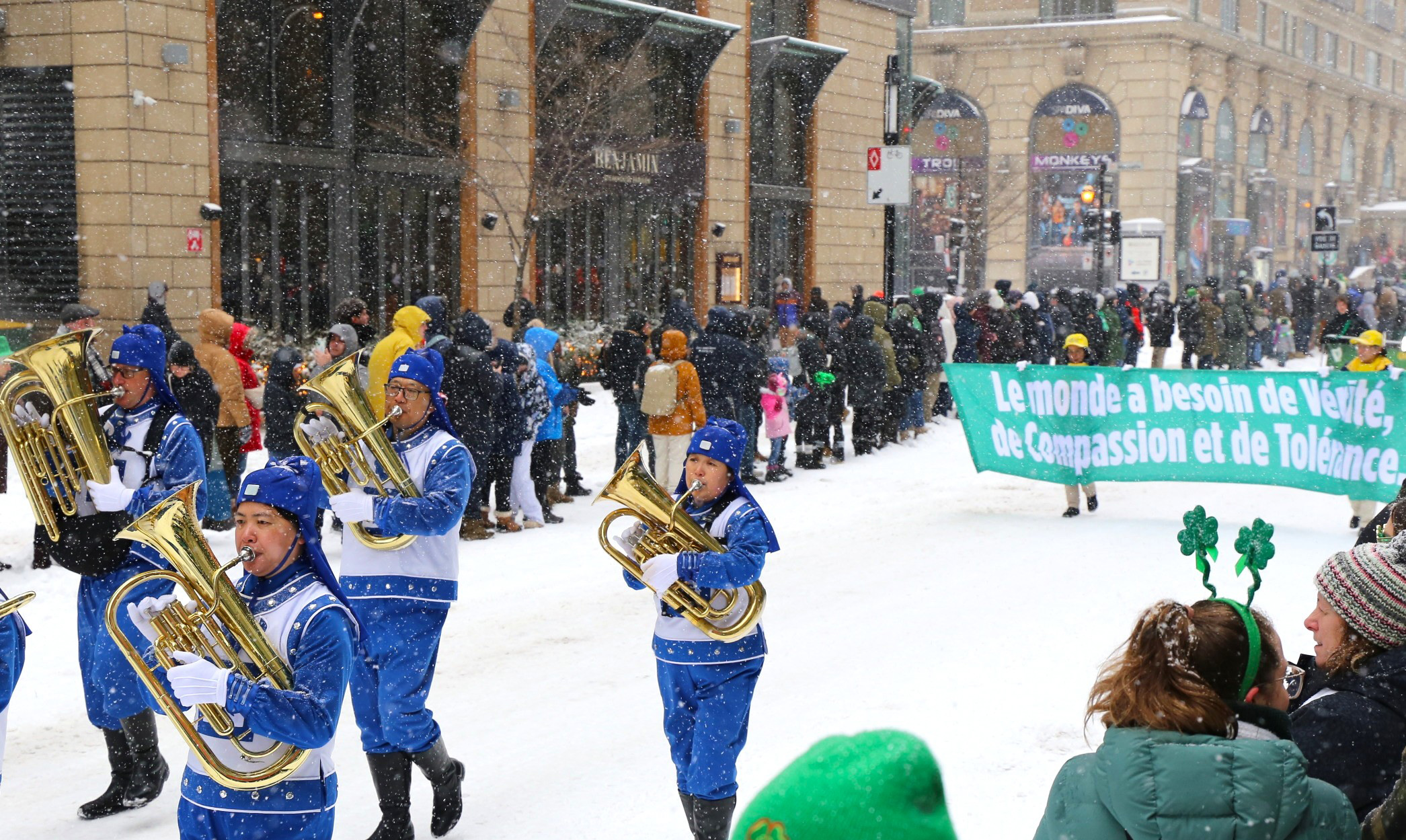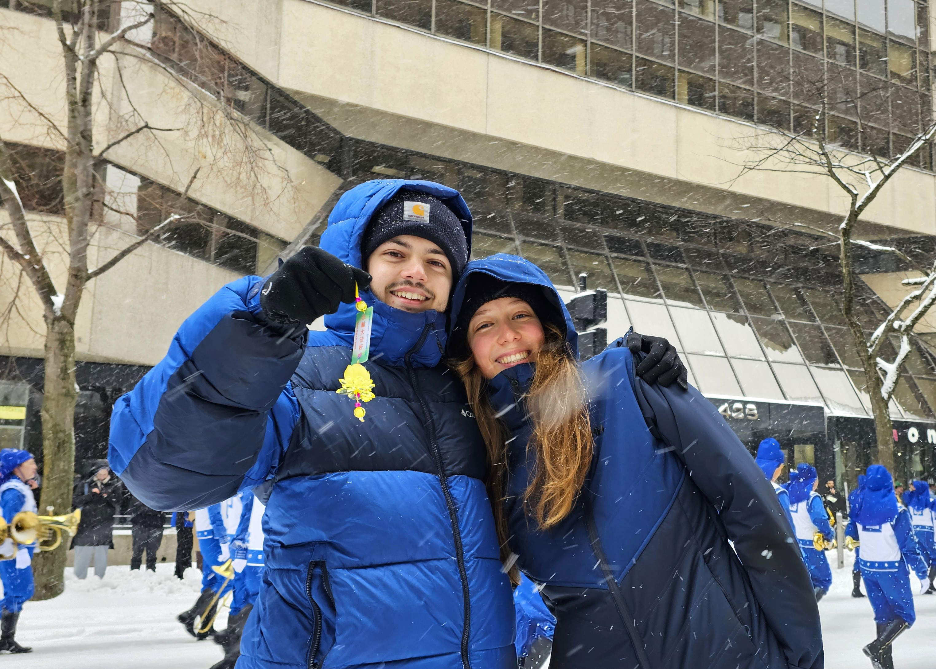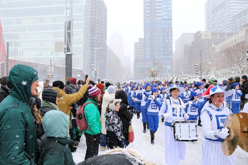 It snowed on the day of the parade, but the cold didn’t dampen people’s enthusiasm. Ninety-two floats, bands, and community groups started off at Fort Street and headed east along Maisonneuve Boulevard. Spectators along the route cheered and clapped. The crowd was often heard shouting “Falun Dafa” when the band marched by.