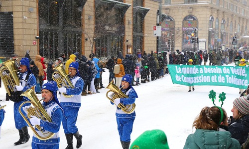 (Minghui.org) People enjoyed the Tian Guo Marching Band in Montreal’s 201st St. Patrick’s Day Parade on March 22, 2026. One spectator said that the band’s message of Truthfulness-Compassion-Forbearance “is an inspiration for everyone.”