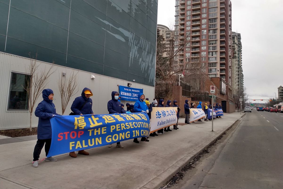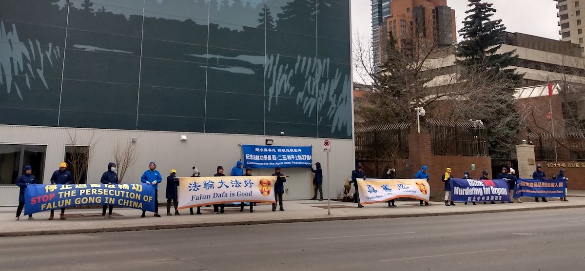 In front of the Chinese consulate on April 24, practitioners in Calgary commemorated the 27th anniversary of the April 25 Peaceful Appeal.