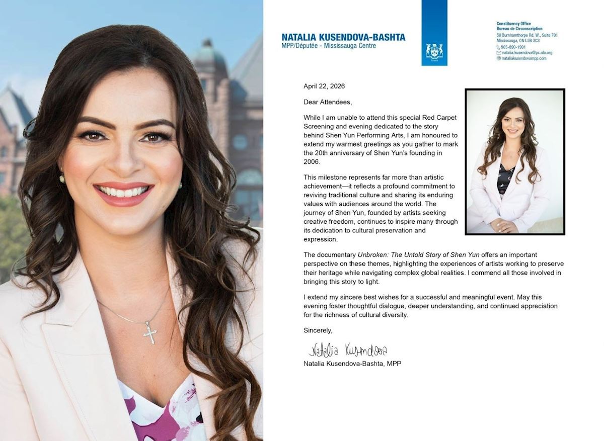 Natalia Kusendova-Bashta MPP wrote in her letter, “The journey of Shen Yun, founded by artists seeking creative freedom, continues to inspire many through its dedication to cultural preservation and expression.”