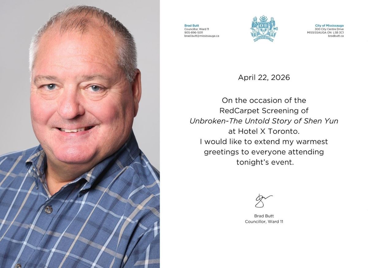 Mississauga City Councilor Brad Butt wrote, “I would like to extend my warmest greetings to everyone attending tonight’s event.”