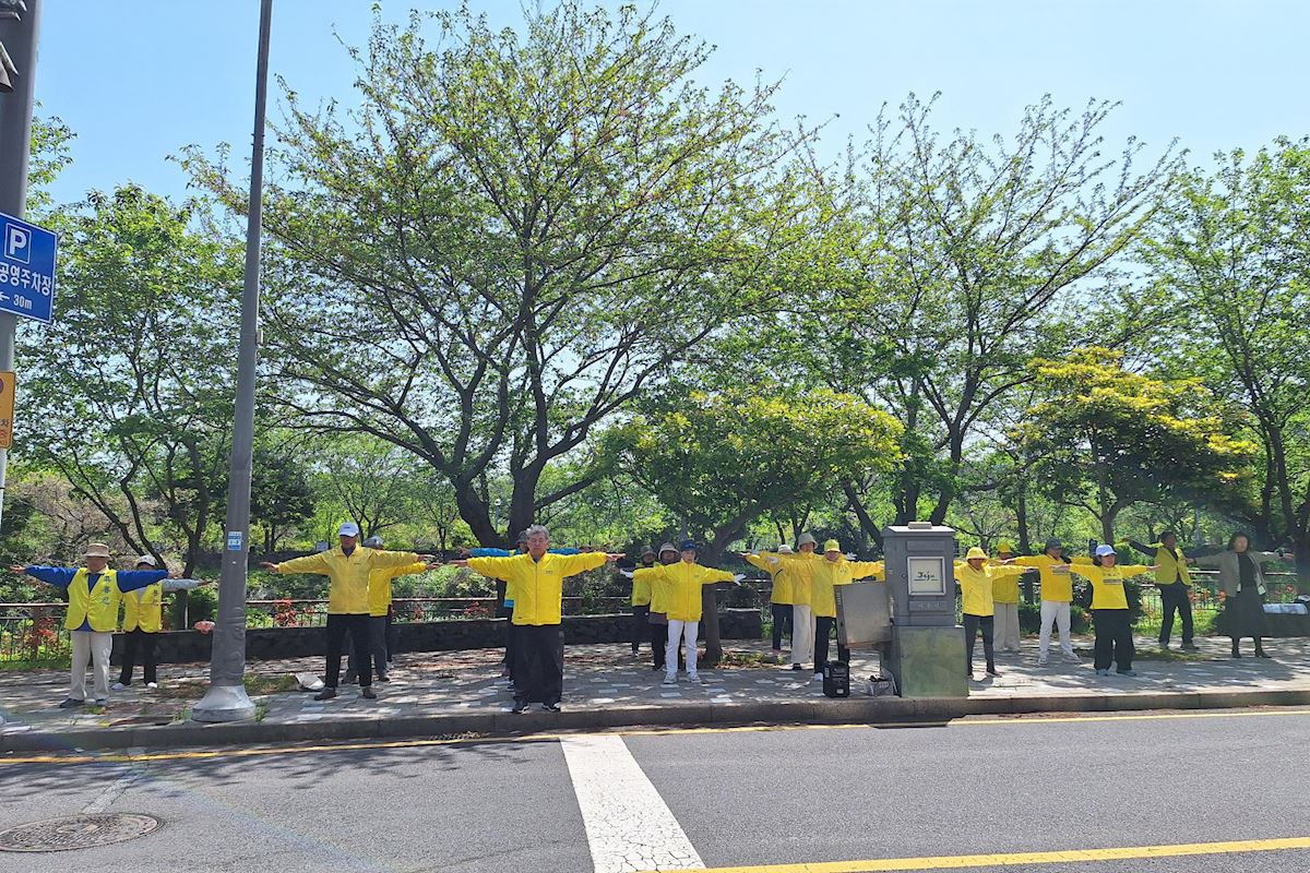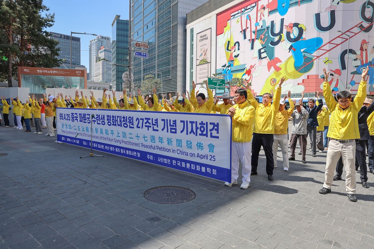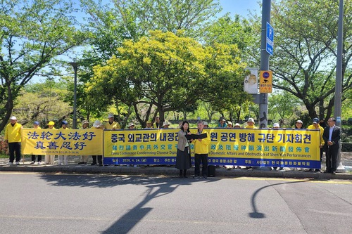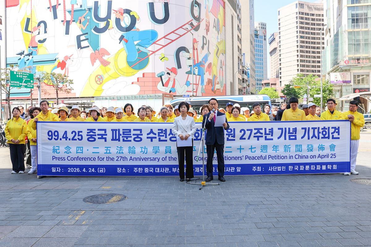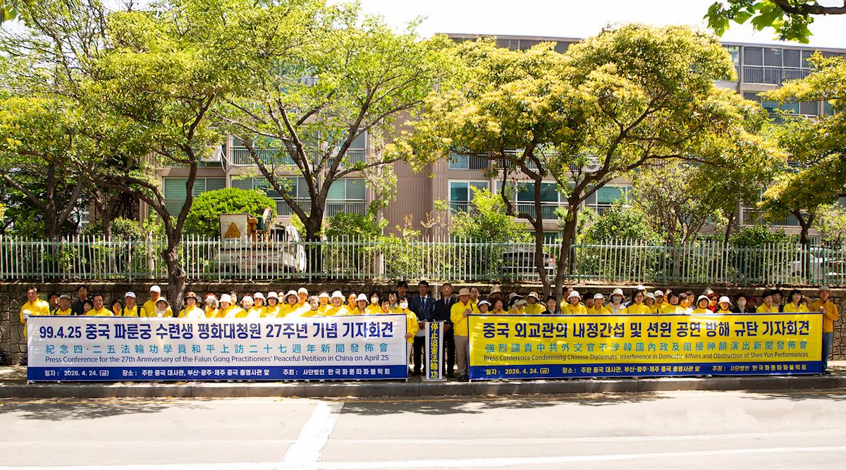 (Minghui.org) The South Korean Falun Dafa Association held press conferences in front of the Chinese Embassy in Seoul and the Chinese Consulates in Busan, Gwangju, and Jeju on April 24, 2026. They commemorated the 27th anniversary of the April 25 appeal in Beijing and protested Chinese diplomats’ interfering with South Korea’s internal affairs and interfering with Shen Yun performances.