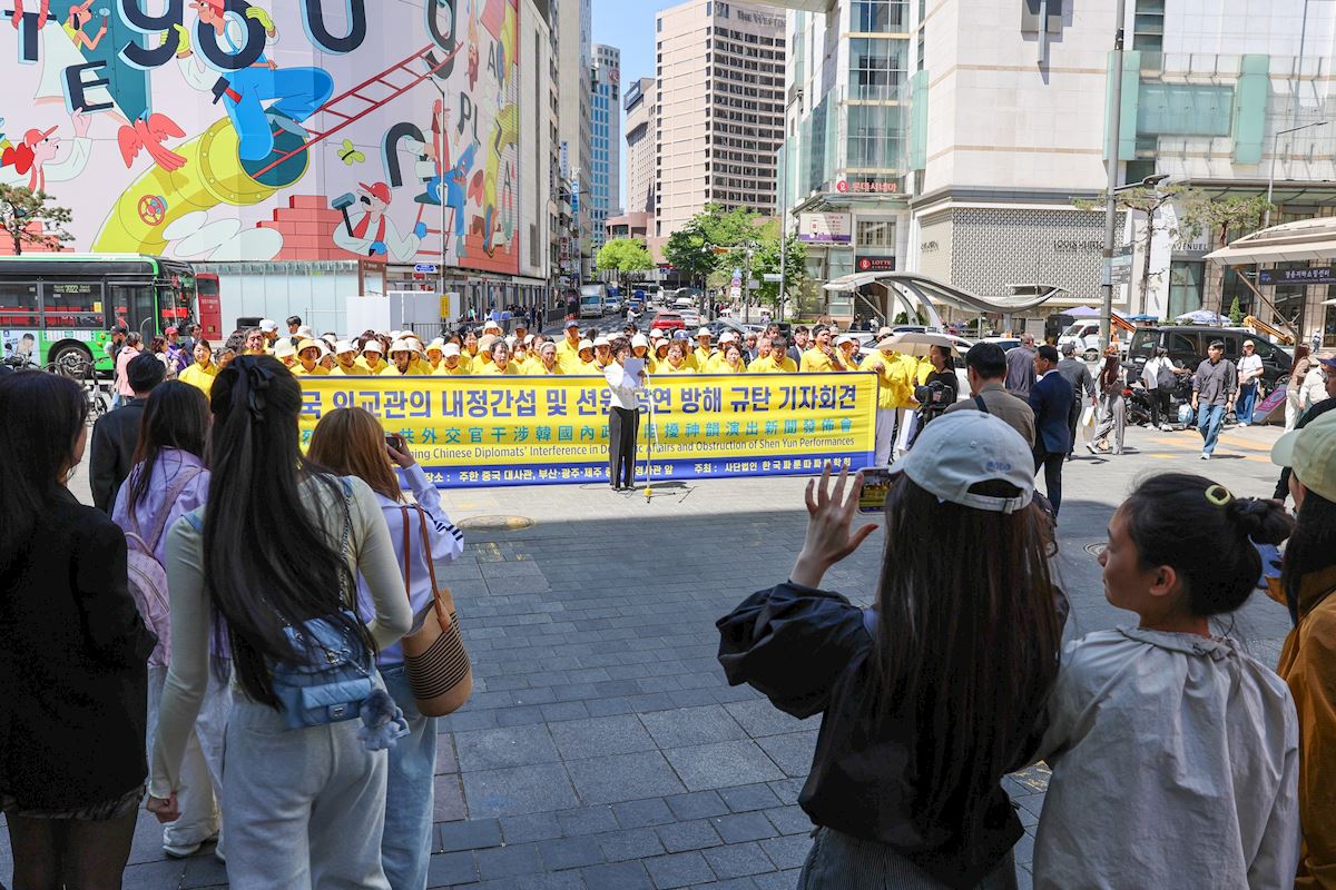 Press conferences were also held in front of the Chinese consulates in Busan, Gwangju, and Jeju. The police said they were very concerned about the bomb threat that was made to disrupt the Shen Yun performances in Busan.