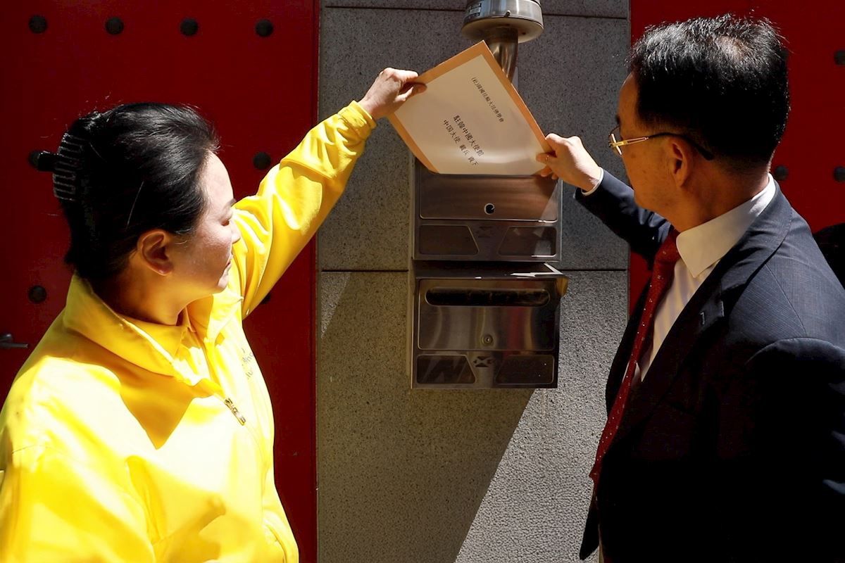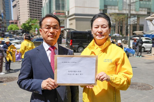 Members of the South Korean Falun Dafa Association deliver a statement to the Chinese Embassy.