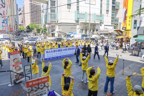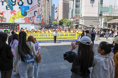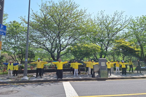 Many people stopped and watched as Falun Dafa practitioners did the exercises before the press conference in Seoul.