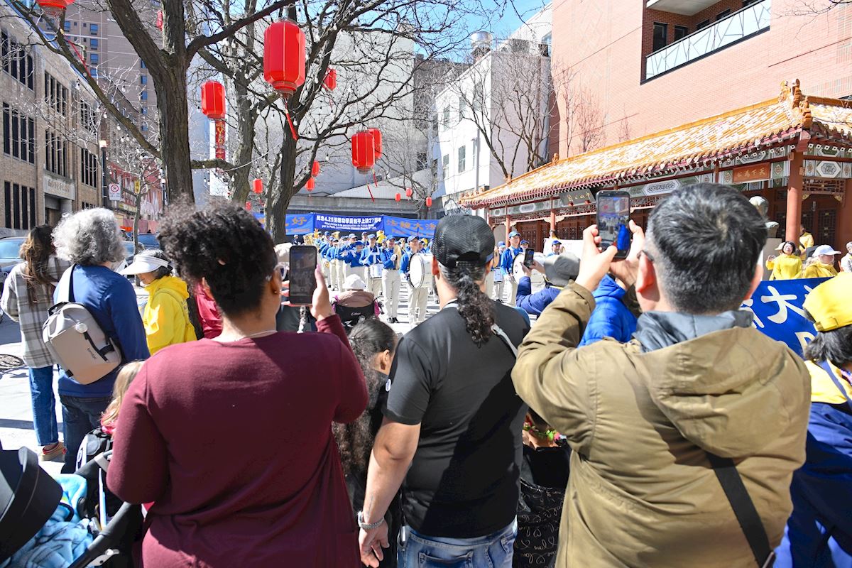 The speeches at the rally were given simultaneously in Chinese, English, and French. The Tian Guo Marching Band played, and practitioners demonstrated the exercises. Many passersby applauded and expressed their approval.