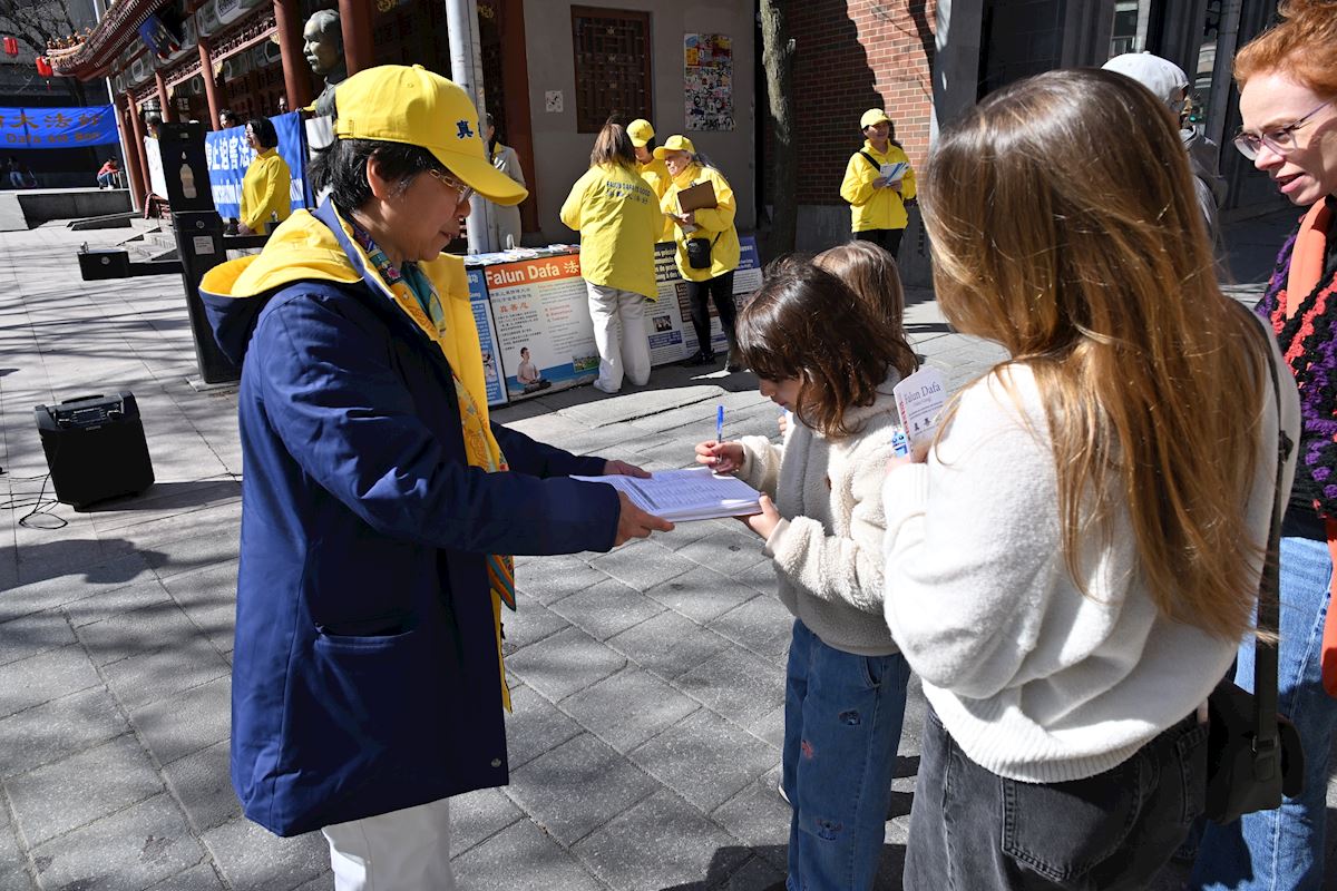 (Minghui.org) Practitioners held a rally in Montreal, Canada’s second-largest city, on April 25 to commemorate a peaceful appeal in Beijing 27 years ago and to introduce people to Falun Gong.